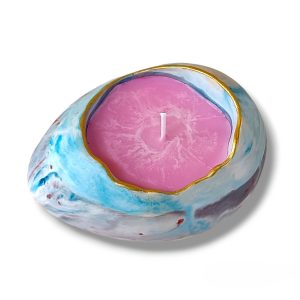 Χειροποίητο επιτραπέζιο διακοσμητικό, αυγό από τσιμέντο. Είναι βαμμένο σε λευκή απόχρωση, με λεπτομέρειες χρυσού και ασήμι, και στη μέση του είναι διακοσμημένο με μπεζ δαντέλα, αφιέρωση σε ξύλινη πλακέτα, λουλούδι και φύλλο από πολυμερικό πυλό .