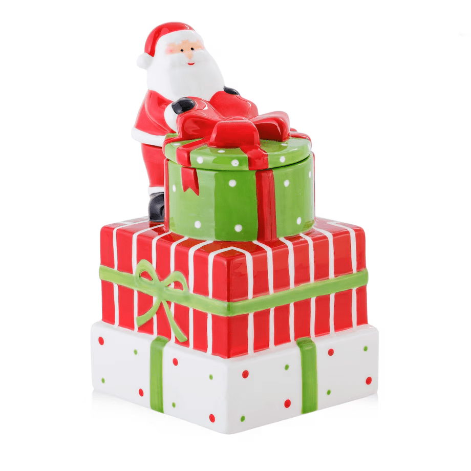 Κεραμική Χριστουγεννιάτικη Μπισκοτοθήκη Αγιος Βασίλης με Δώρα. Κεραμική μπισκοτοθήκη με αποσπώμενο καπάκι Αγιος Βασίλης με Δώρα. Σχεδιασμός σε σχήμα στοίβας δώρων. Χρώματα: κόκκινο, πράσινο και λευκό. Διαθέτει μεγάλο κόκκινο φιόγκο στο πάνω μέρος. Υλικό: Κεραμικό. Οι διαστάσεις της είναι 28εκ. ύψος και 25 εκ. φάρδος. Θα την παραλάβετε μαζί με τη συσκευασία της.
