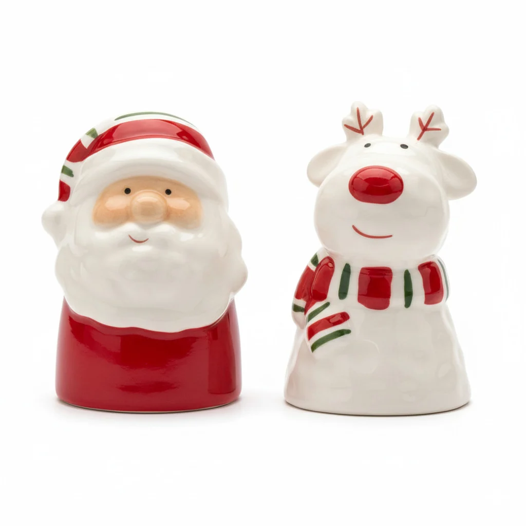 Σετ Αλατιέρας και Πιπεριέρας με Άγιο Βασίλη και Τάρανδο. Πρόκειται για ένα σετ αλατιέρας και πιπεριέρας με θέμα τον Άγιο Βασίλη και έναν τάρανδο. Το σετ είναι κεραμικό με γιορτινό, χριστουγεννιάτικο σχέδιο. Η μία αλατιέρα έχει τη μορφή του Άγιου Βασίλη με κόκκινο καπέλο και γενειάδα. Η άλλη έχει τη μορφή ταράνδου με κόκκινη μύτη και ριγέ κασκόλ. Αυτά τα διακοσμητικά αντικείμενα χρησιμοποιούνται για την προσθήκη αλατιού και πιπεριού στα γεύματα.