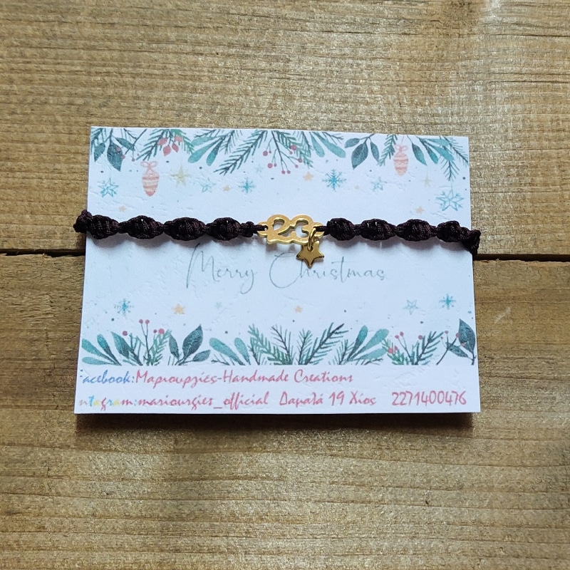 Χειροποίητο macrame βραχιολάκι γούρι 2023 με καφέ macrame πλέξη και ατσάλινα επιχρυσωμένα στοιχεία 23 και αστεράκι.